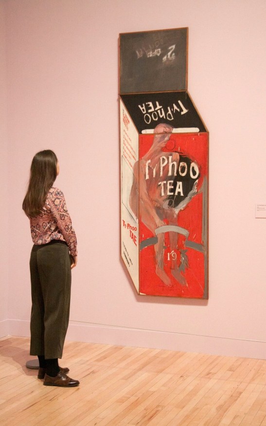 The first, though, does not. The Third Tea Painting, 1961, was part of Demonstrations of Versatility during Hockney’s time at London’s Royal College of Art. This painting of a Typhoo Tea tin is in illusionistic style, rather than his earlier phase of abstract art.