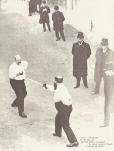“The last Parisien duel. In 1902 between the Marquis de Dion (at left) and the socialist deputy Gerault (the latter injured).” [“Richard” omitted in the original.]