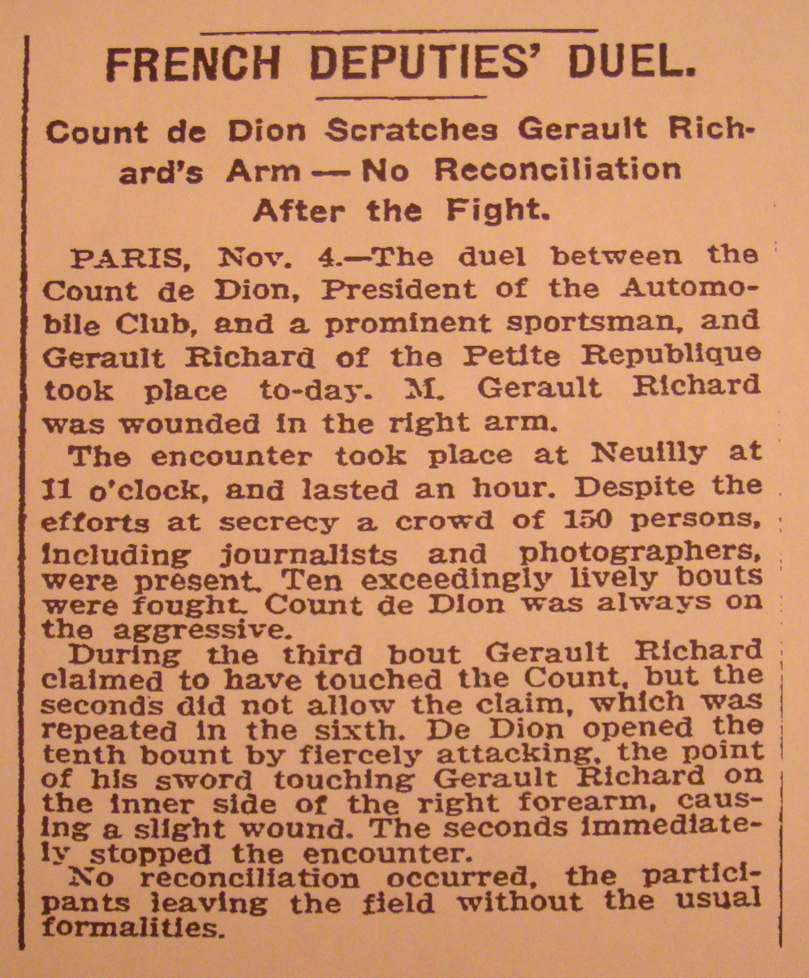 Alas, nothing was settled. De Dion gave Richard a scratch on the arm. “No reconciliation occurred, the participants leaving the field without the usual formalities.”