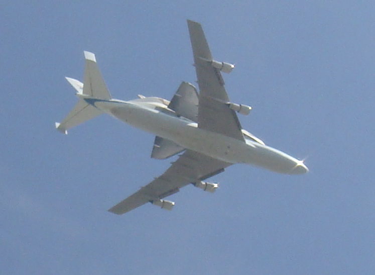 And, in fact, the Shuttle and its 747 passed almost directly overhead. We yelled and cheered; a woman nearby enthusiastically waved a hand-painted sign; another reported her heart rate soared to 140 beats/minute.