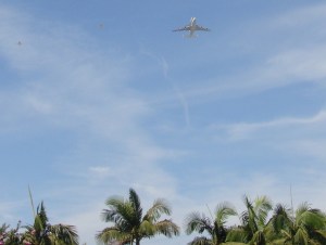 At the same time, wife Dottie and I had chosen the middle of the Downtown Disney parking lot in Anaheim. A goodly number of people agreed with us that the vastness of the lot gave us an excellent view of whatever path the 747/Shuttle and its T-38 escorts selected.