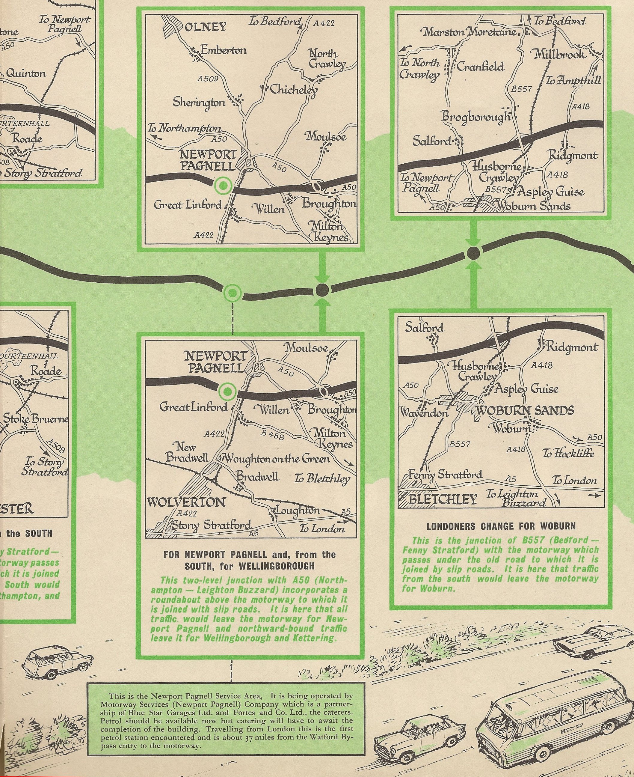 Maps helped motorists find entrances and exits along the way from London’s northwest to the vicinity of Birmingham.