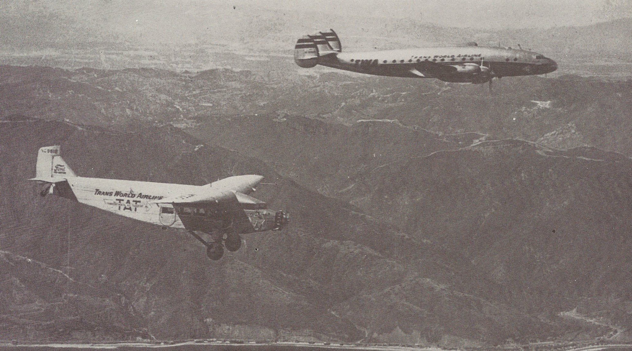 In 1949, Trans World Airlines celebrated the 20th anniversary of its predecessor TAT with this fine aerial display of a Ford Tri-Motor and Lockheed Constellation.
