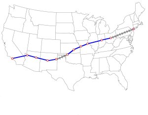 New York City to Los Angeles: Overnight train to Columbus, Ohio. Ford Tri-Motor to Indianapolis, St. Louis, Kansas City, Wichita and Waynoka, Oklahoma. Then an overnight train to Clovis, New Mexico. Finally, a Tri-Motor from Clovis to Albuquerque, Winslow, Kingman and, finally, Los Angeles.