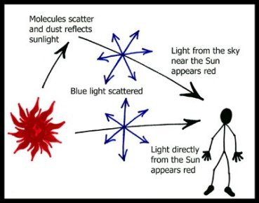The blue is because of Rayleigh scattering. Light from the sun consists of a full spectrum, red, orange, yellow through green, blue and violet (plus other wavelengths that aren’t visible). Passing through the atmosphere, the red end travels unscathed. However, the blue gets affected by nitrogen molecules that then radiate it in all directions.
