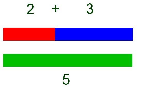 Suppose I have one stick that’s 2 units in length and place it end to end with one that’s 3 units in length. There’s no surprise in noting that these two, end to end, equal one that’s 5 units in length. Numerically, 2 + 3 = 5. Geometrically, the same thing.