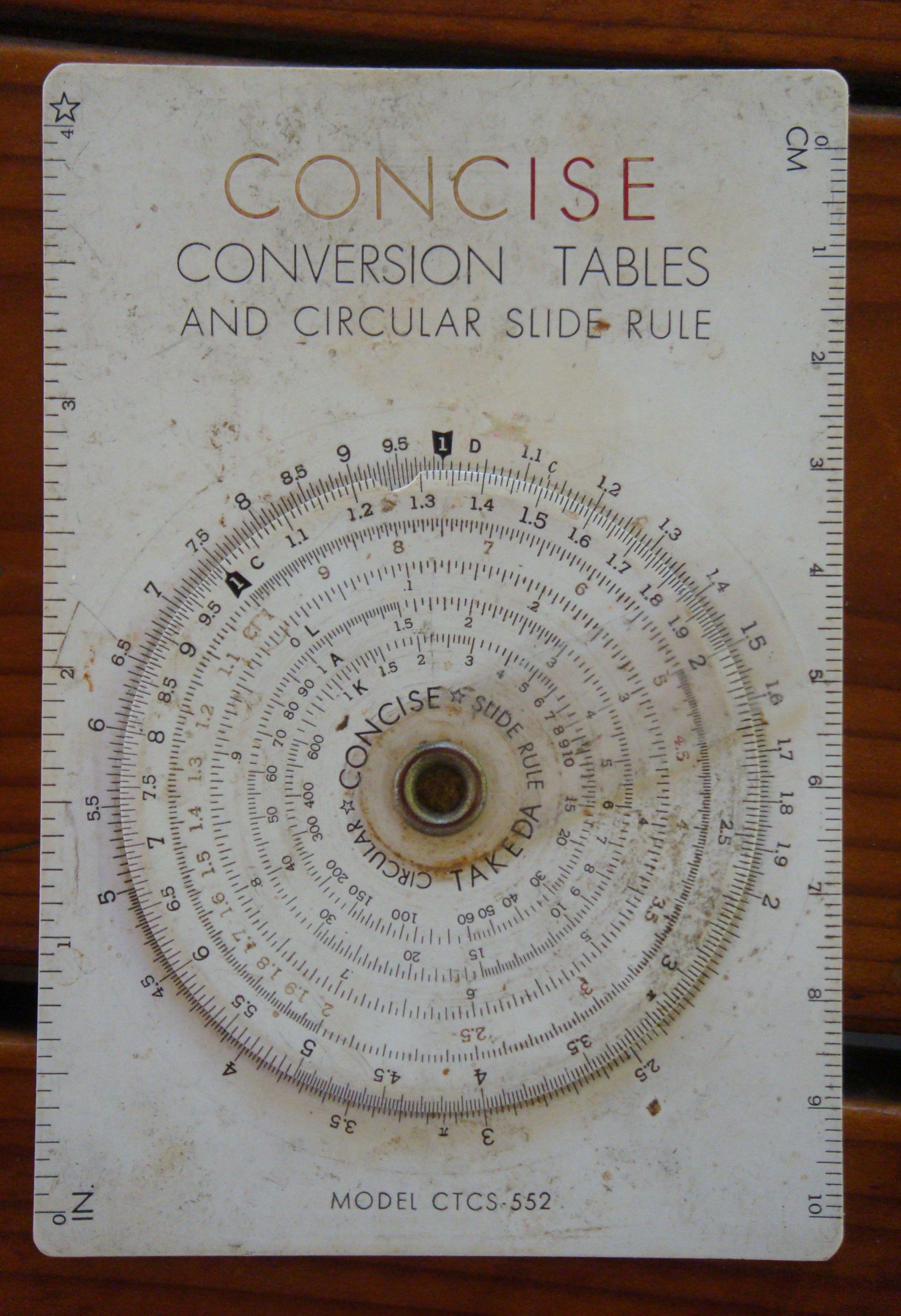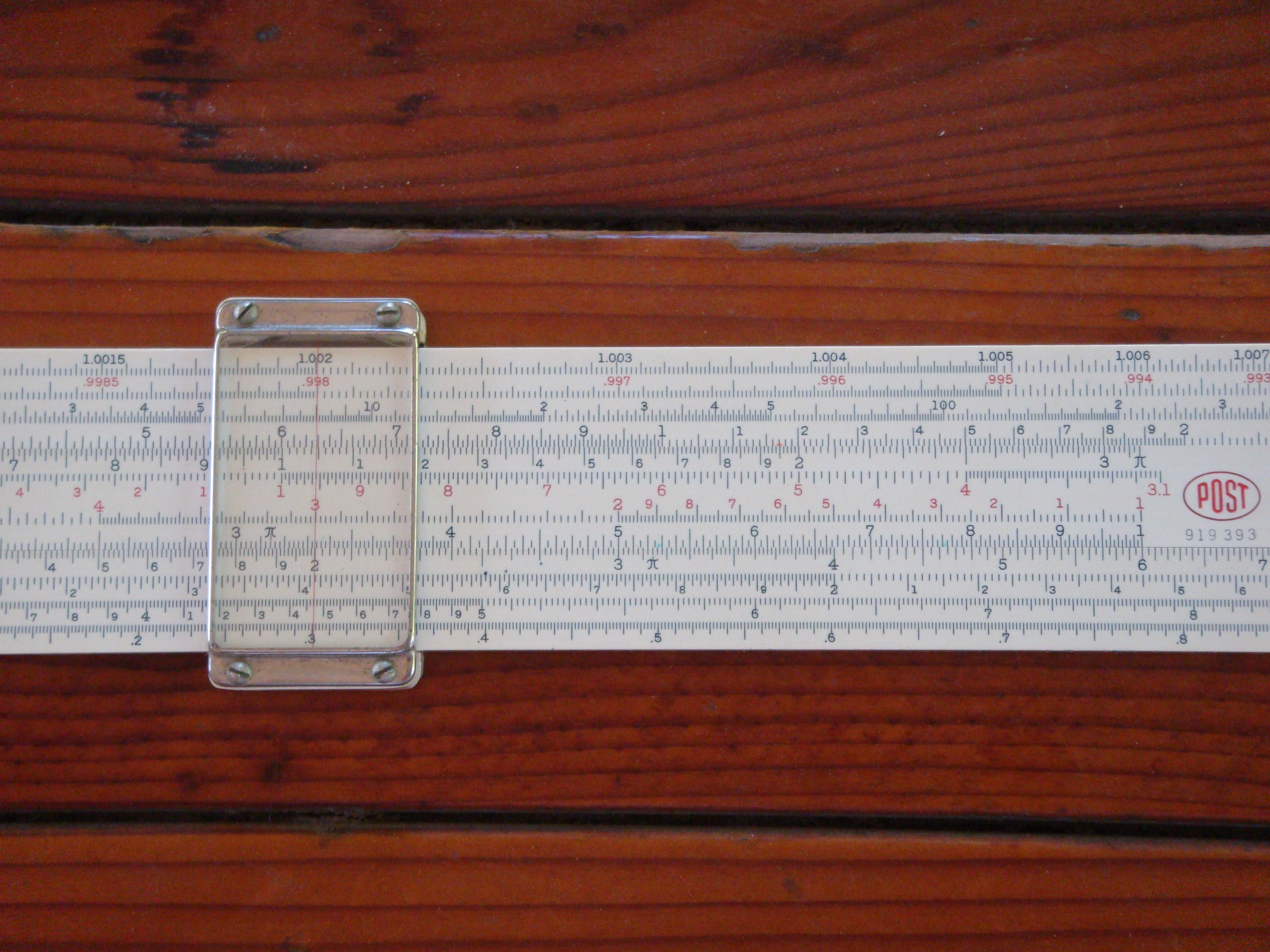And so it is with a slide rule. Its numerical scales are arranged logarithmically, the basic C and D scales reading from 1 to 10, the CI scale inverted and running from 10 to 1. There’s a sliding hairline cursor as well.
