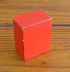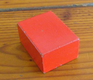Contained in its color-coordinated box are 27 blocks. Three of them are cubes, the blue one the largest, the red one intermediate, the white one the smallest. The remaining 24 are rectangular shapes, not cubes though their sizes relate to those of the cubes.