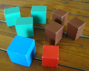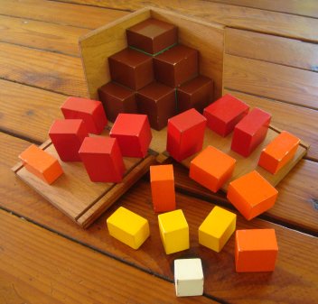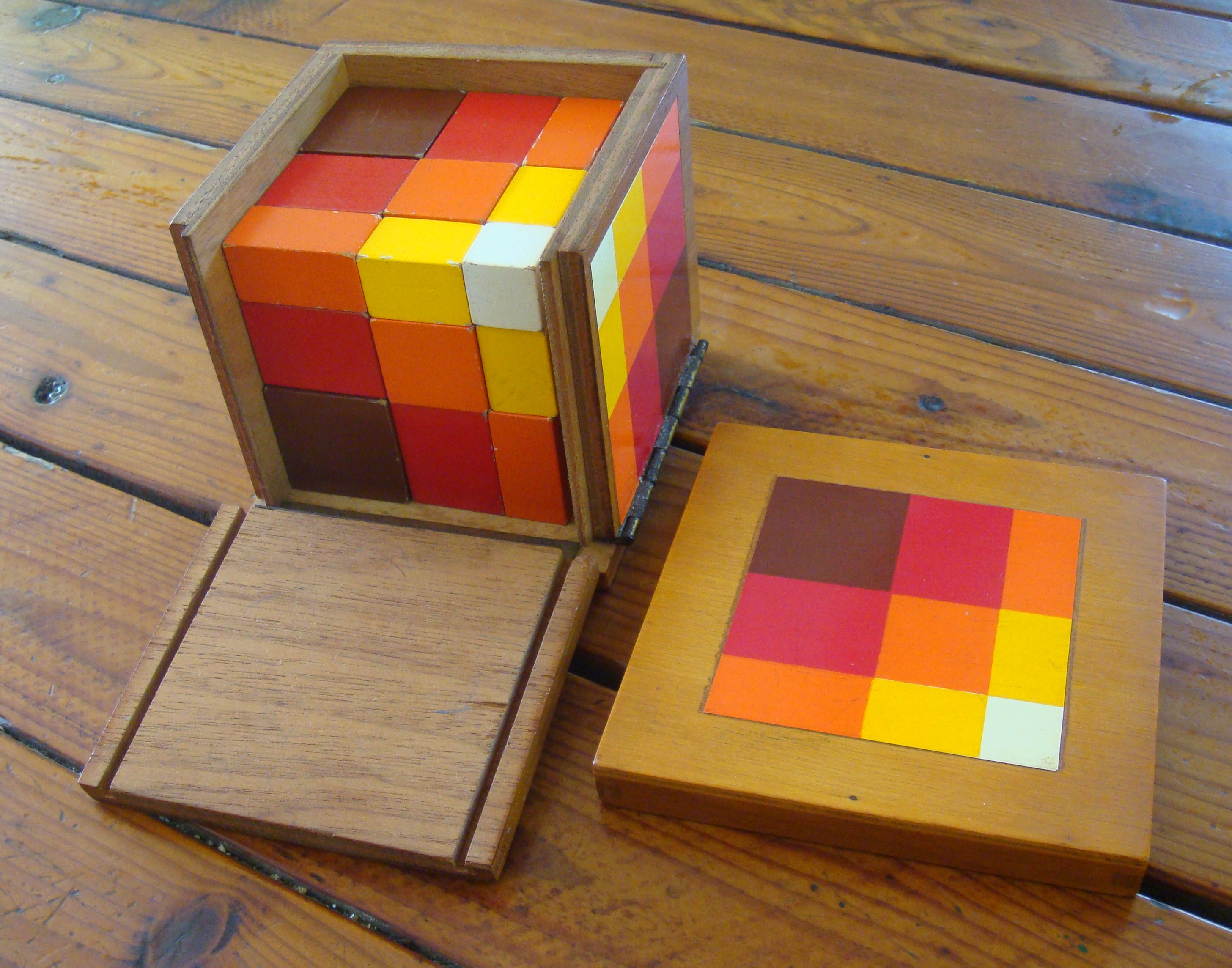 I FIRST encountered a Trinomial Cube—as opposed to its purely algebraic and possibly intimidating namesake, (A+B+C)3—when I lived in the Caribbean in the 1970s and daughters Suz and Beth went to the St. Thomas Montessori School. One day soon I’ll share bits about Maria Montessori and the Association Montessori Internationale she founded. This time, I’m going to dance back and forth between mathematics and early childhood education as encouraged by this artful collection of multi-colored blocks.