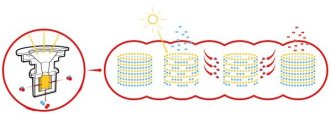 The sun superheats a cerium oxide capsule, driving off more and more oxygen. When steam is sprayed onto the oxygen-starved material, it grabs the oxygen, thus free up the hydrogen. Illustration by mckibillo, in Technology Review, October 2012.