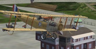 This Microsoft Flight Simulator Jenny JN-4 buzzes the Brooklands clubhouse.
