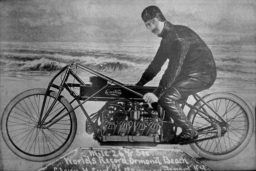 By 1907, the design had evolved into a V-8, albeit still air-cooled. Glenn earned the world speed record—land, water or air!—in taking his V-8 motorcycle across the sands of Ormond Beach, Florida, at 136.36 mph. This record wasn’t bettered in the air until 1911; no motorcycle went faster until 1930.