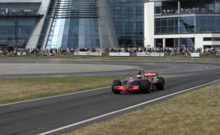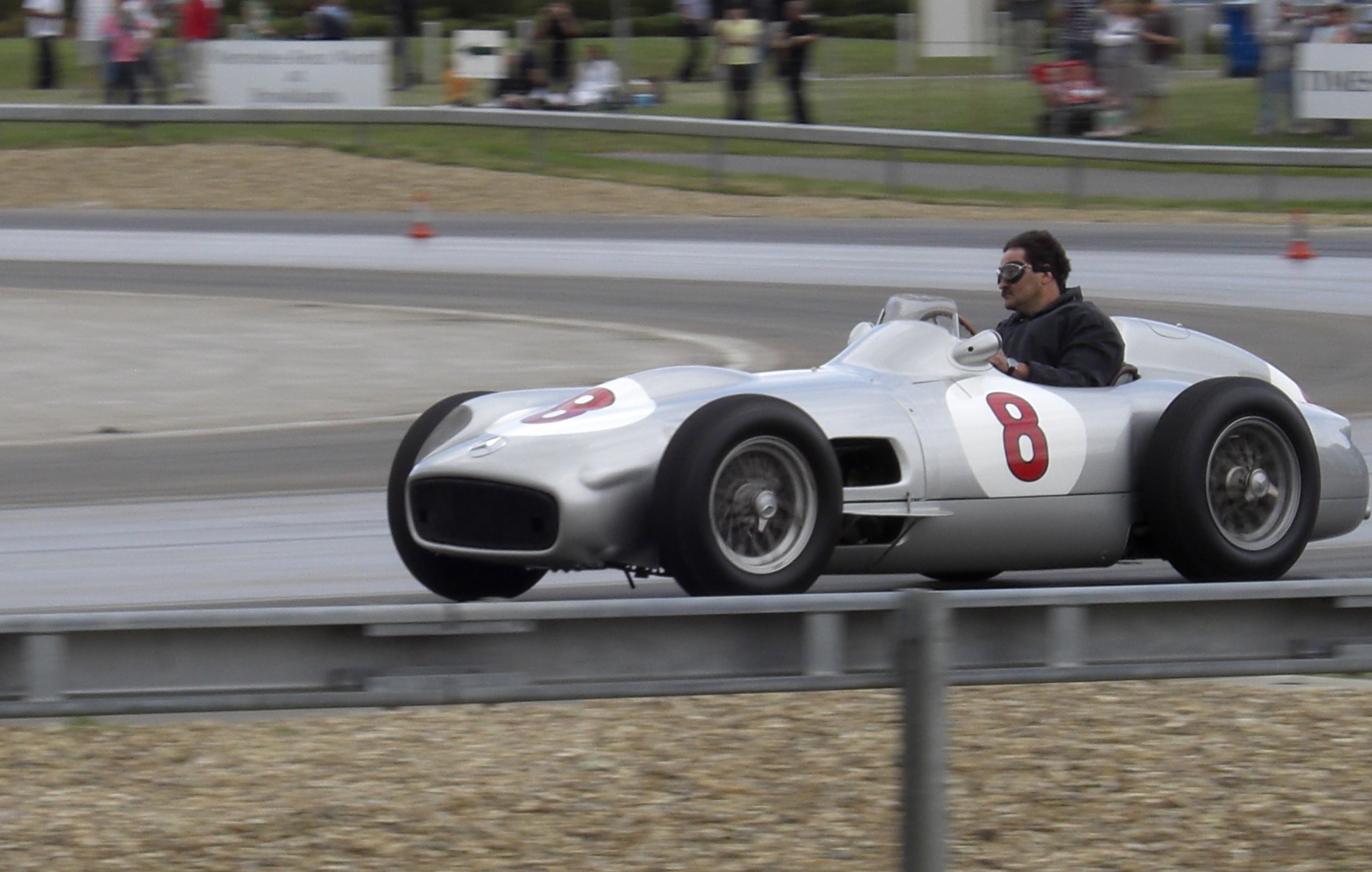 Above, Lewis Hamilton demonstrates the controlled fury of a modern McLaren. Below, a Mercedes-Benz W-196 Grand Prix car from the mid-1950s.