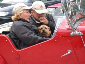 An MG TD driver ponders the instructions; a navigator ponders the road ahead; a dog poses for the camera.