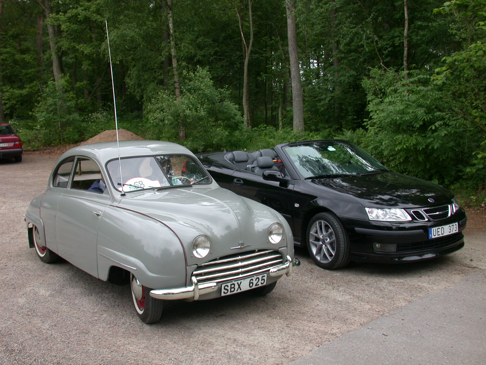 This 1954 Saab 92 B poses with its great-grandchild, the 2004 Saab 9-3 Convertible that had us visiting Sweden.