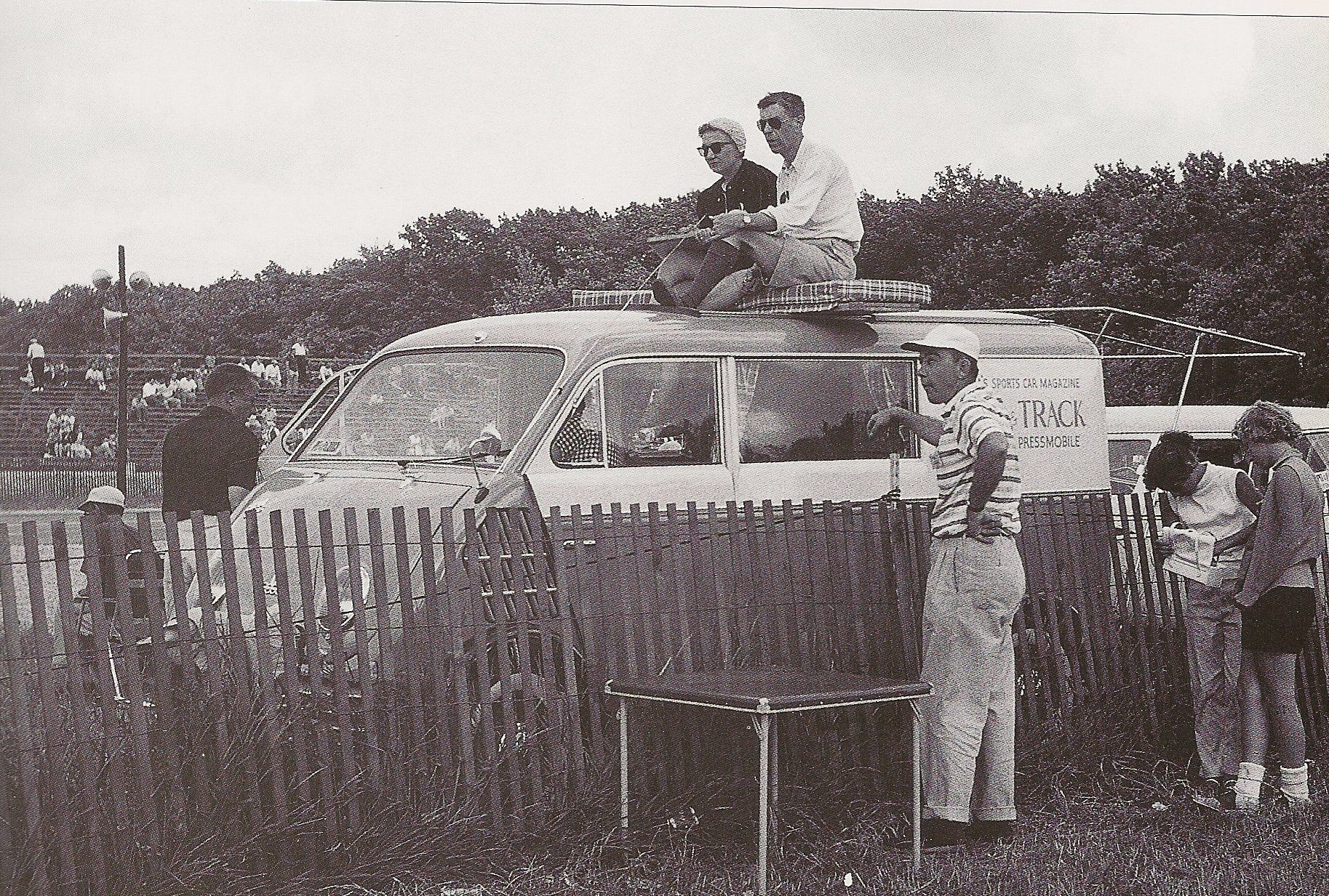 John and Elaine Bond got a good view of sports car races from atop the Road & Track Pressmobile, a DKW in suitable livery. That’s editor-to-be Dean Batchelor standing next to them. Elkhart Lake, Wisconsin, 1956.