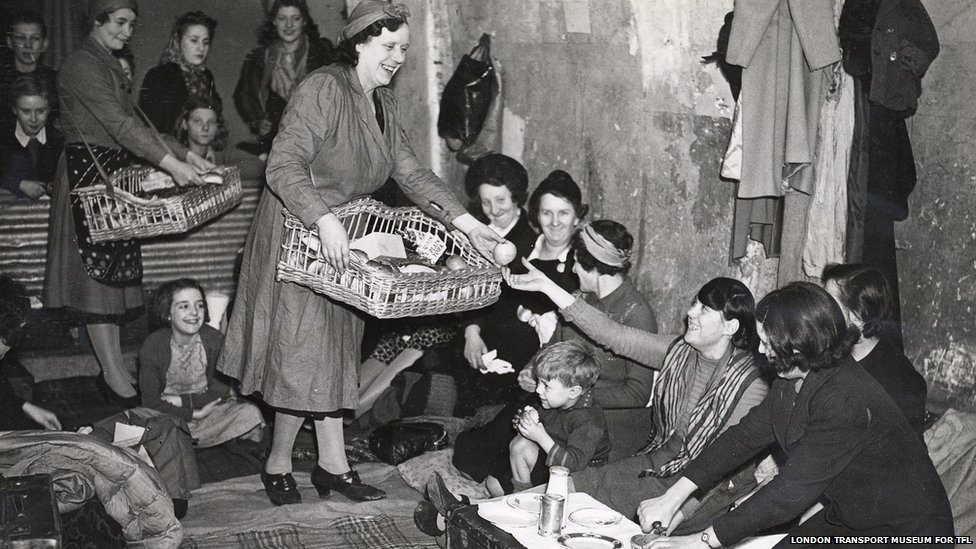 During the Nazi Blitz, 1940-1941, Londoners sought nightly shelter below ground. Image from the London Transport Museum.