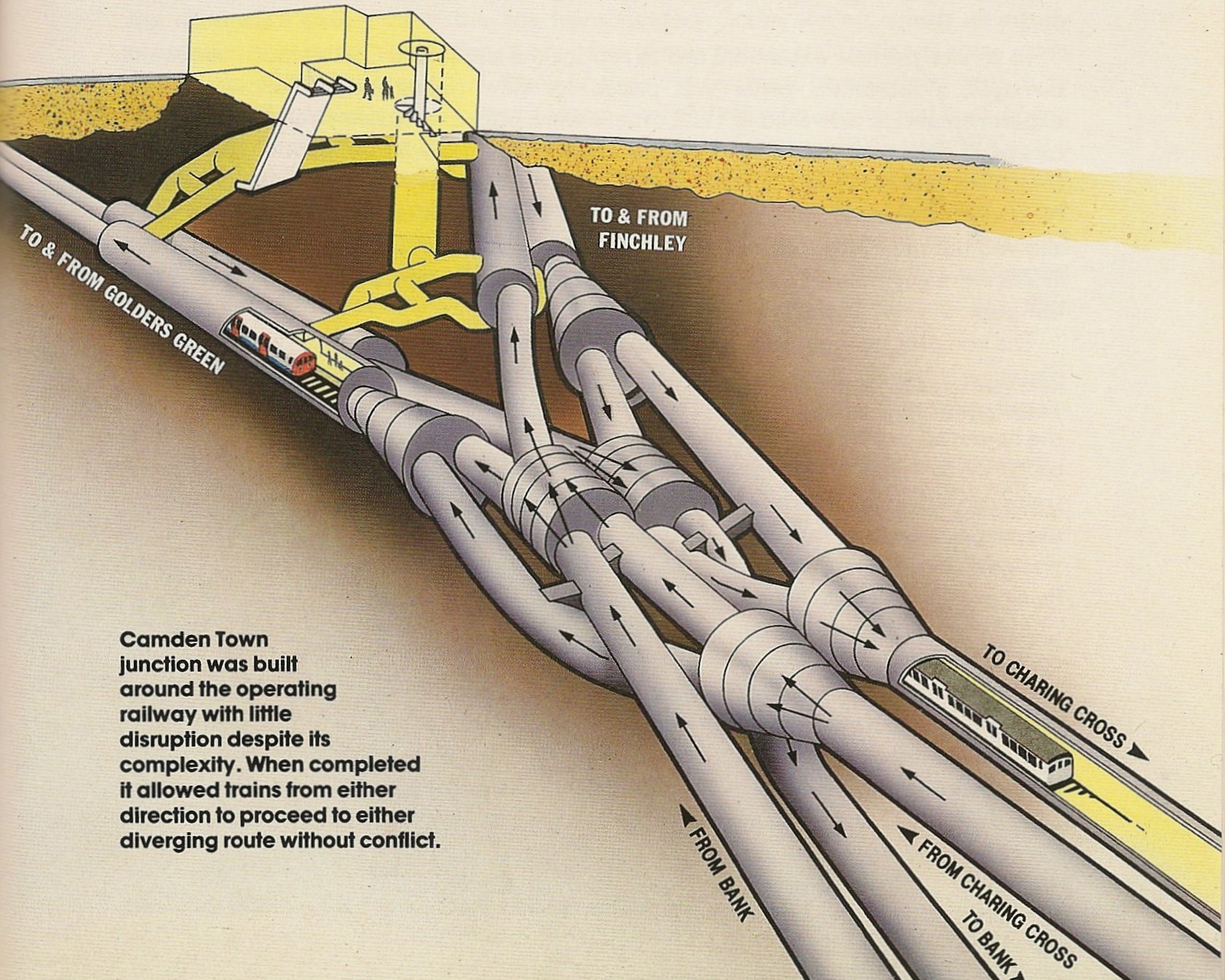The design of Camden Town junction is regarded as a major engineering achievement. Underground transport passes over, under and through the station with a maximum frequency of 110 trains an hour.