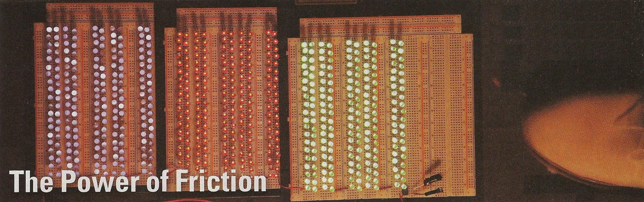 An advanced piezoelectric generator powers 600 LED bulbs through foot tapping. Image from Science, 4 January 2013.