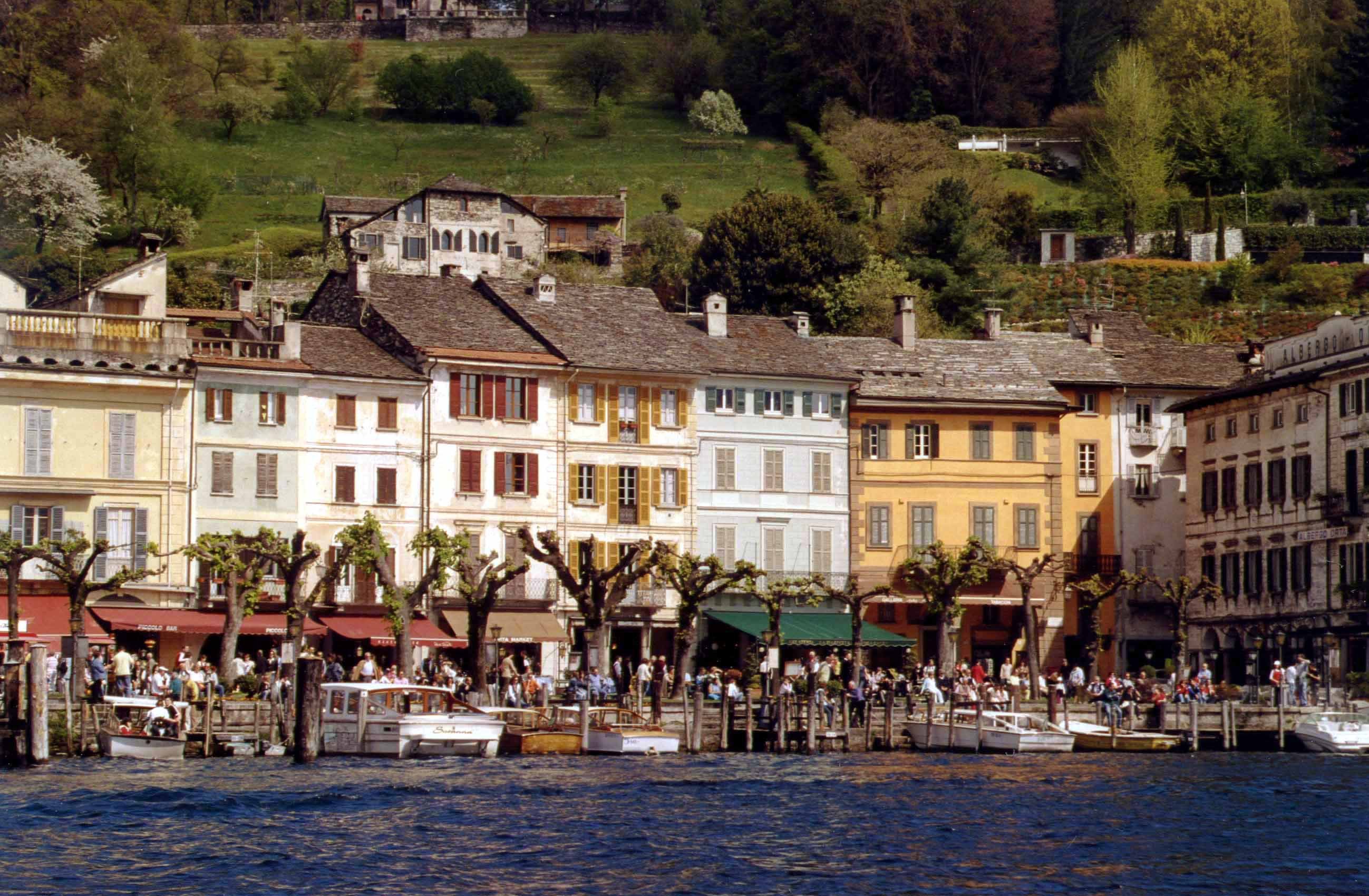 Piazza Motta faces Isola di San Giulio, the lake’s only island, barely 900 ft. by 460 ft. but containing the Basilica di San Guilio, built in the 1100s, and a Seminary (now a Benedictine monastery).