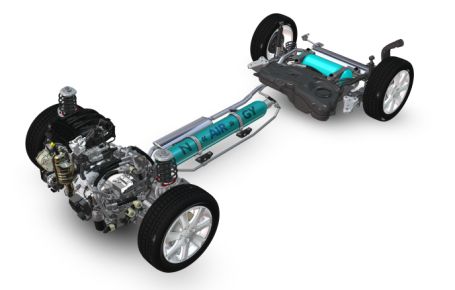 The PSA Hybrid Air system has high-pressure air storage amidships, air stored at lower pressure at the rear, a pump/motor integrated with the powertrain up front and regenerative braking.