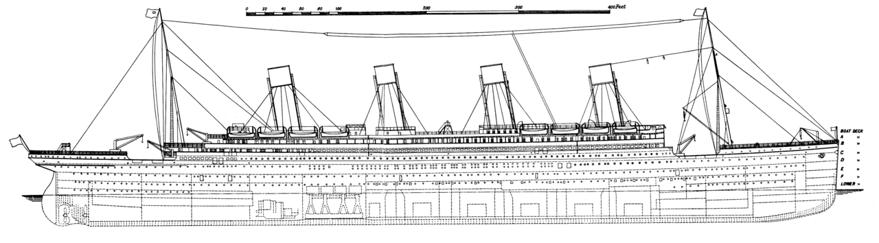 As its name suggests, the Boat Deck held the lifeboats. Promenade or A Deck was First Class; Bridge or B Deck, mostly First Class, some Second; Shelter or C Deck, a mixture of all three Classes; Saloon or D Deck, another mixture of the three; Upper or E Deck, all three; Middle or F Deck, Second and Third Class; Lower or G Deck, the lowest accessible to passengers. Below these, Orlop Decks were for cargo; Tanks Top, for engines, boilers and other mechanicals.