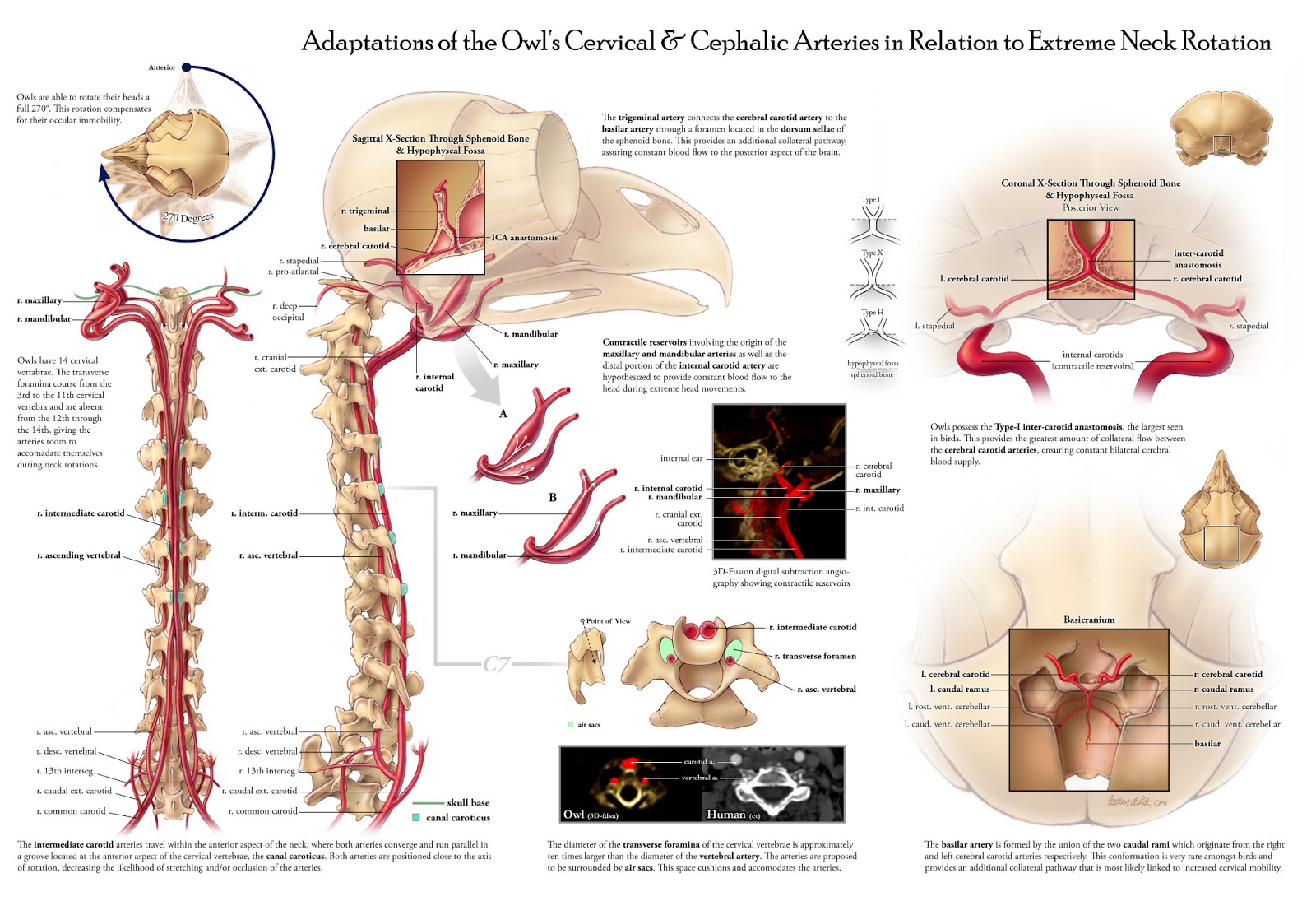 The title of the poster is quite a mouthful, “Adaptations of the Owl’s Cervical & Cephalic Arteries in Relation to Extreme Neck Rotation.”