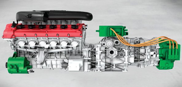 The F70’s smaller electric motor is linked to its 6.3-liter V-12 and runs auxiliary systems. Its primary motor resides aft of the gearbox, with power electronics atop the transaxle.