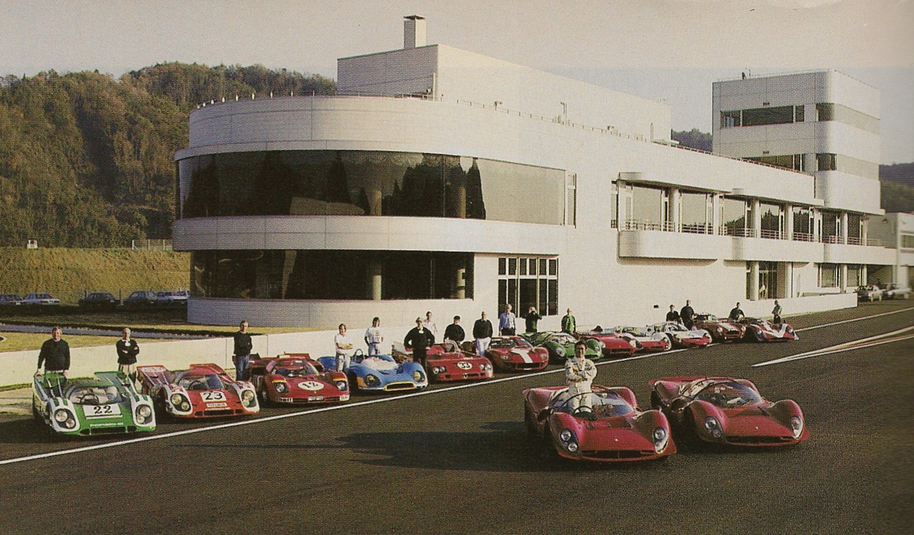 Hajime Tanaka and his Ferraris, along with other members and their cars, pose in front of the pit-side clubhouse. That second story had a gourmet restaurant with TVs monitoring the circuit’s corners.