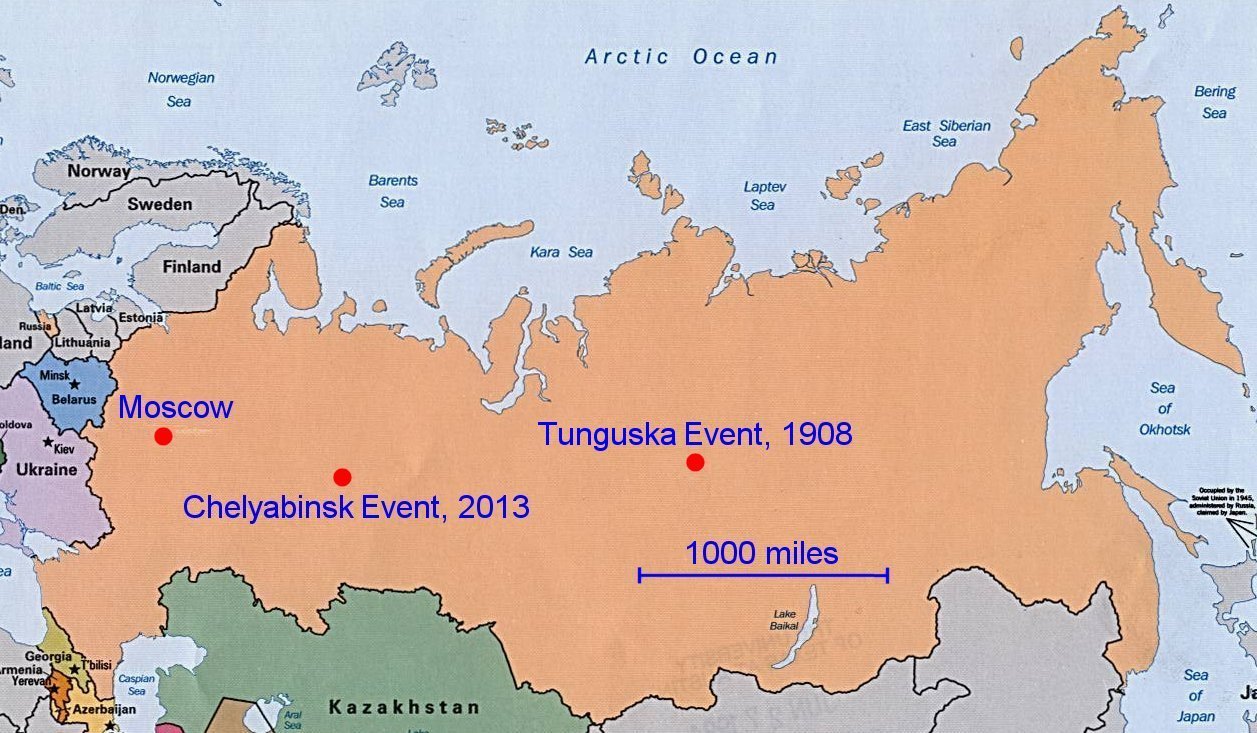 The vastness of Russia has had two significant meteor events in a bit more than 100 years. Original image from www.utexas.edu.