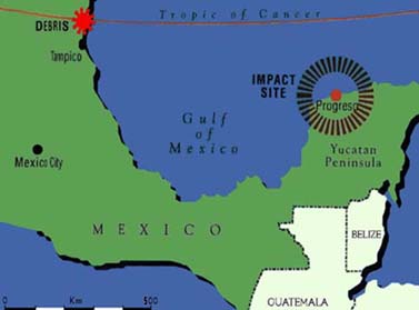 Yucatan Event, circa 66 million years ago. Image from www.earlham.edu.