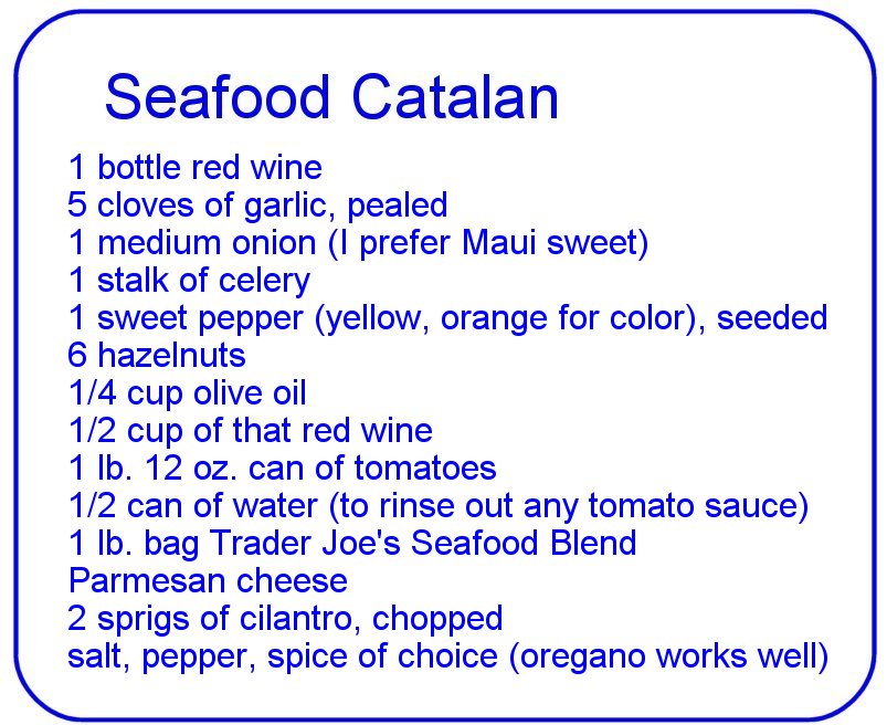 Sip the wine again while preparing the seafood. My wise choice of Trader Joe’s Seafood Blend means there’s little to do but tear open the bag and separate frozen pieces. In truth, any fish, shellfish, seafood or combination works just fine.