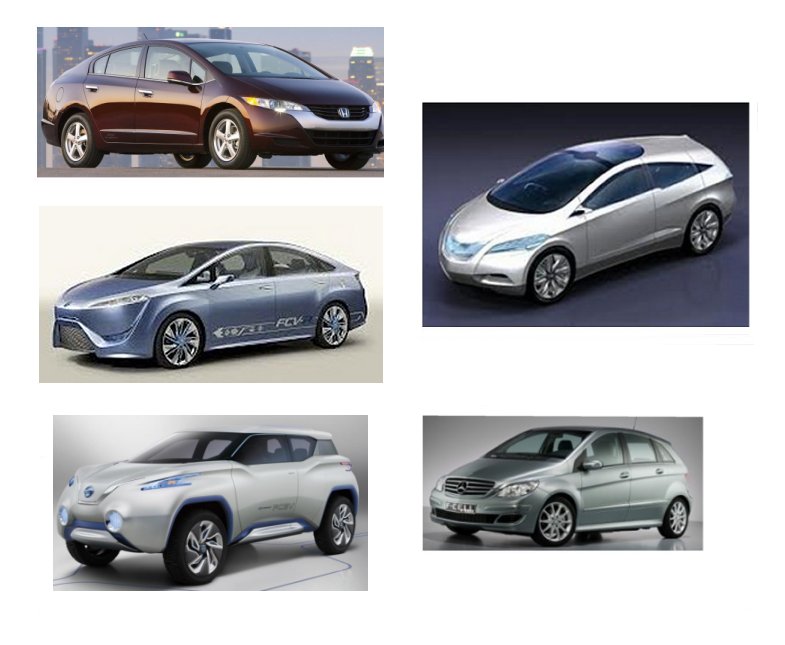 FCEV manufacturers in the 2015-2017 timeframe. Clockwise from the top left, Honda Clarity, Hyundai i-Blue concept, Mercedes-Benz F-Cell, Nissan Terra Concept FCEV and Toyota FCV.