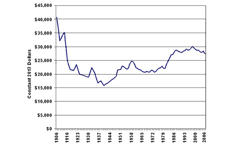 Over the really long term—to the birth of the automobile—prices have actually fallen. Working backwards with the Inflation Calculator, the 2013 average new car price of $31,200 translates into $1327 in 1913. To put this figure in perspective, the average automobile—admittedly quite a luxury back then—actually cost its buyer $1431 in those 1913 dollars.