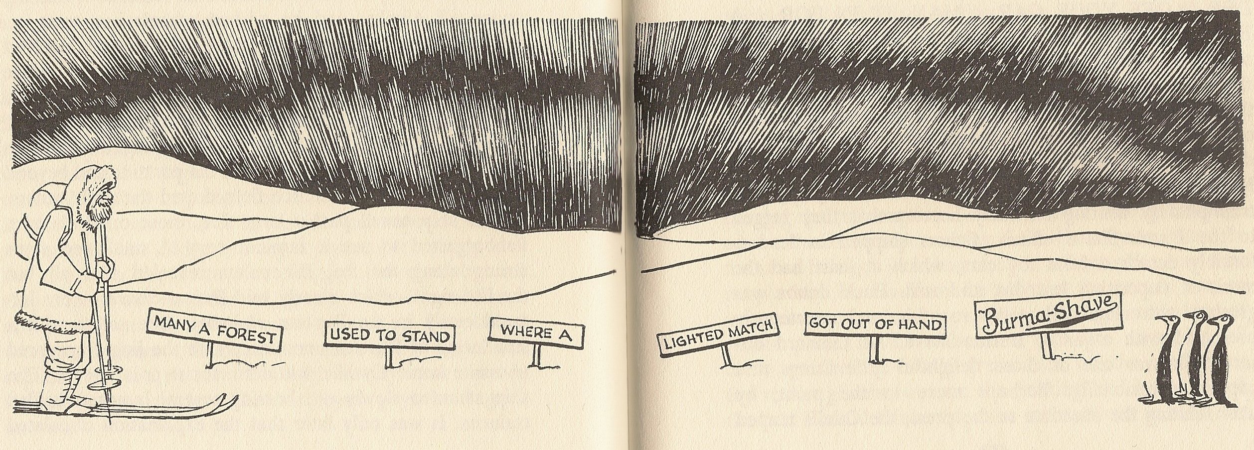 “Don’t expect/These signs today/Legal eagles/Had their way/Burma-Shave.” ds