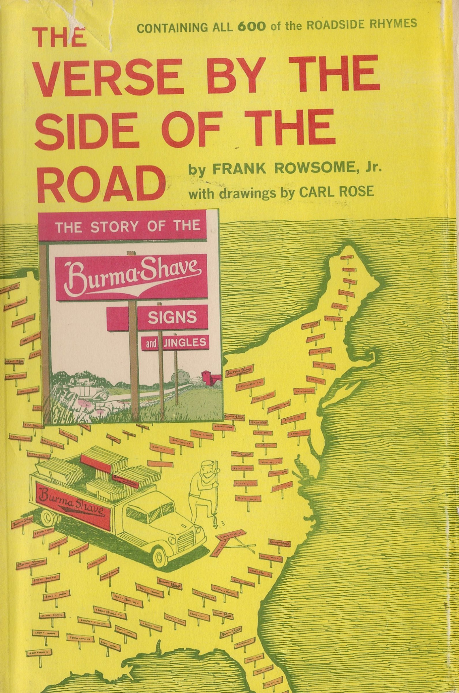 An excellent source: The Verse by the Side of the Road: The Story of the Burma-Shave Signs and Jingles, by Frank Rowsome, Jr., with drawings by Carl Rose, Stephen Green Press, 1973. Both www.amazon.com and www.abebooks.com list it in several different editions.