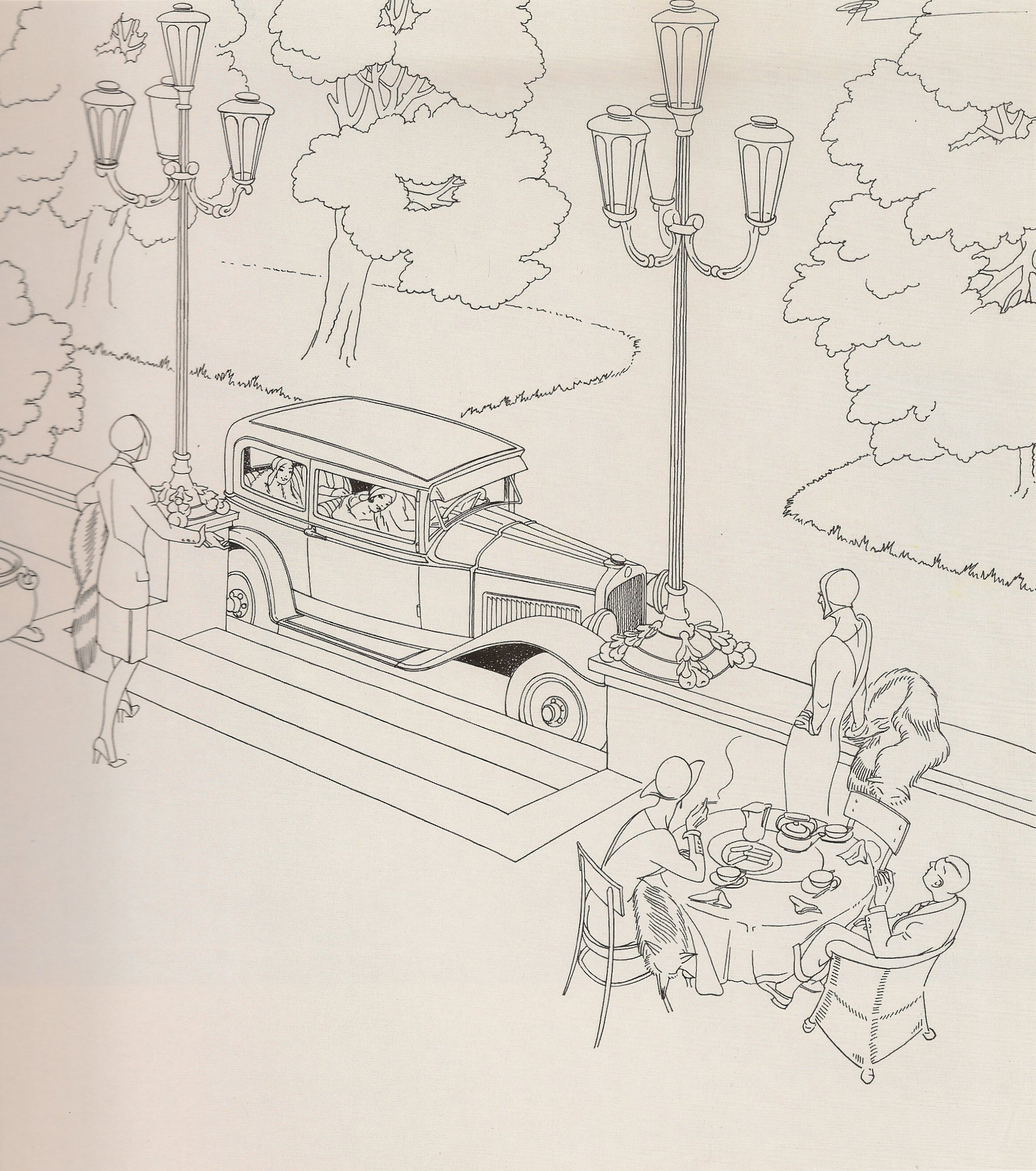 Adding to Romano’s wealth and excess is the casually carried fur far left . . . not to mention the mink stole on the lap of the seated woman. Might fur covered seats have been a 514 option? And the prominent street lamps bring to mind those favored by Fritz Schlump (Feb 4), but Romano’s interpretation is more elegant.