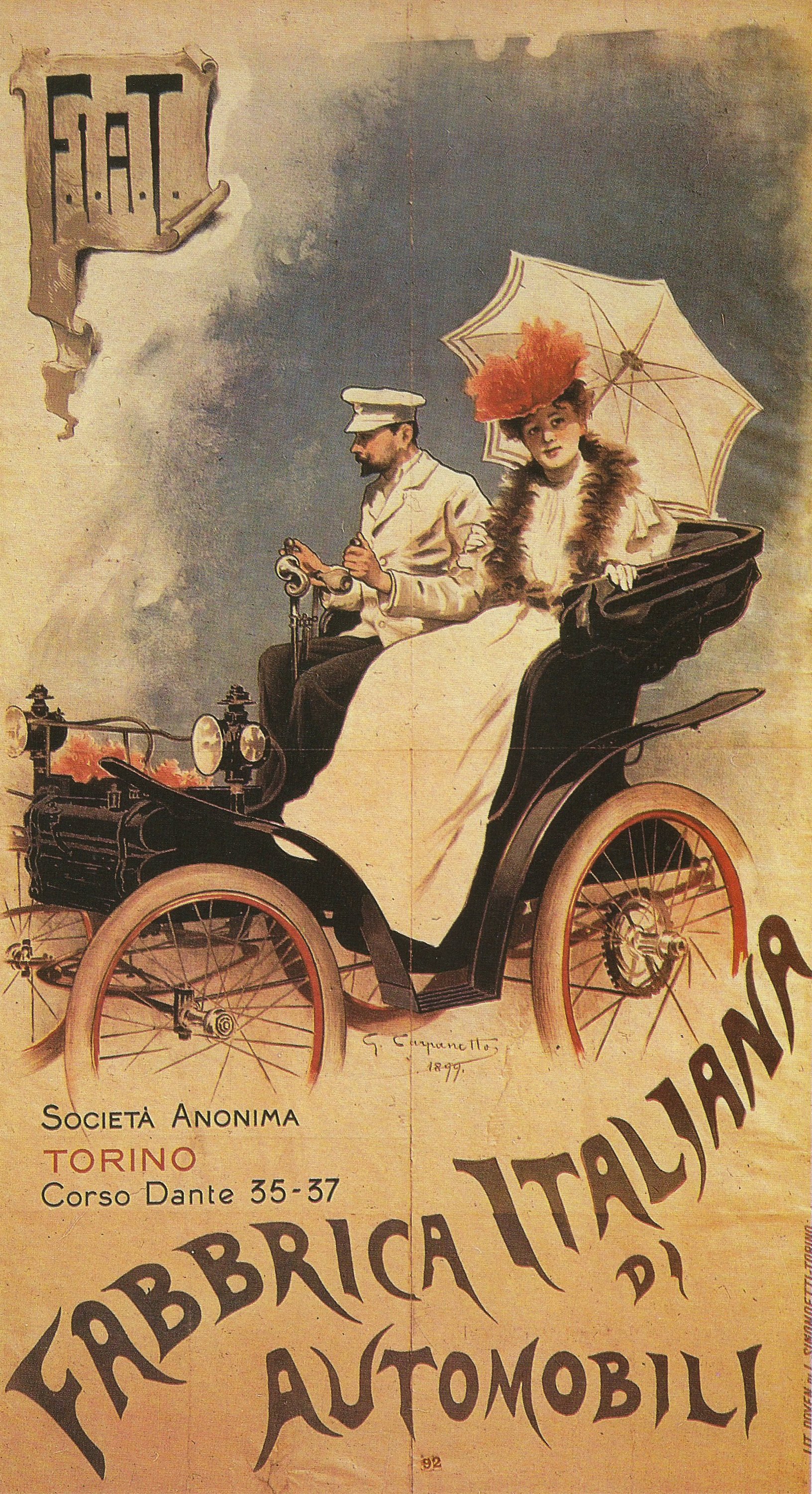 F.I.A.T., Fabbrica Italiana di Automobili Torino, was established by Giovanni Agnelli with several investors in 1899. Its 3 1/2 HP, of which 24 were built, paid homage to the contemporary Benz. In this 1899 poster by Giovanni Carpanetto, the tiller is manned by an evidently capable motorist; no wonder the woman appears serene.