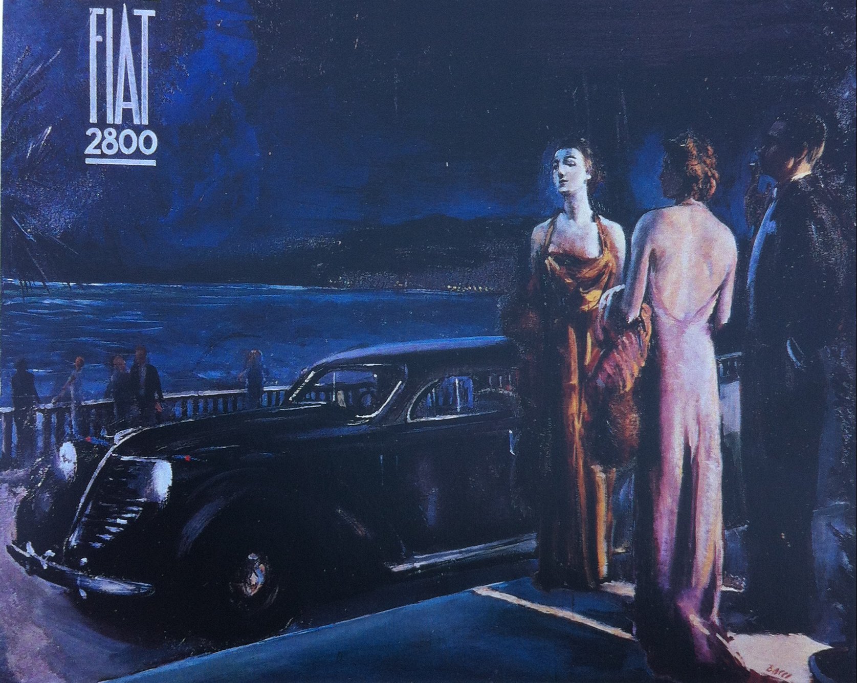 Artist Giuseppe (Nino) Romano, artist and illustrator, also did straightforward product images for Fiat. In this contrasting bit of art, you know that everyone shown is elegant—and wealthy. I love the casually tossed fur.