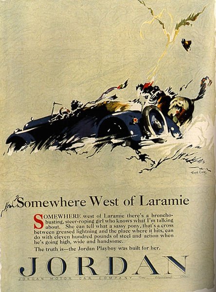This gal is racy even today. She’s clearly in the same sisterhood as the “Somewhere west of Laramie” girl, another flapper changing the image of the automobile—and of women.