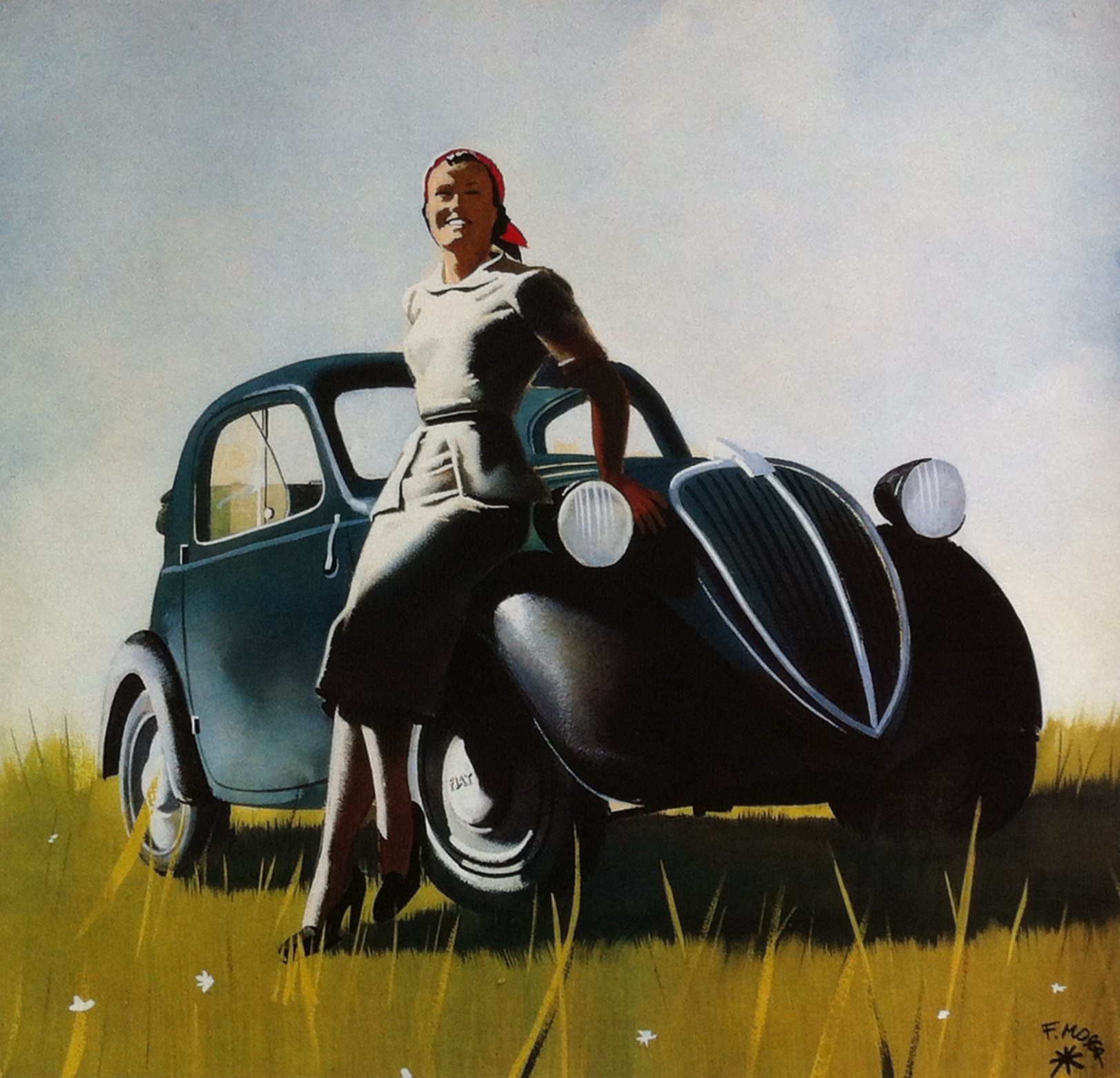 From 1922 to 1945, Italy succumbed to Fascismo. This 1936 sketch is in a gentle folksy genre. But notice the stylish fatigues of the driver standing next to her Topolino. Artist Massimo Quaglino was a landscape painter and caricaturist as well as Fiat illustrator.