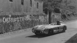 Juan Manuel Fangio in his 2nd-placing Mercedes-Benz 300SLR, Targa Florio, 1955. Note the “V Castellotti,” as in “Viva;” variously written with an intertwined “VV.” Image from Daimler-Benz Archives.