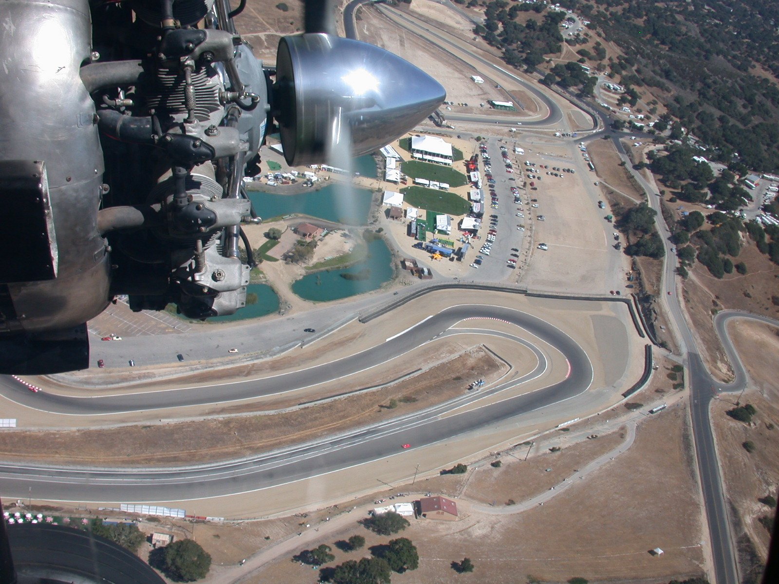 Turns 1, 2 and 3 of the Laguna Seca circuit, as seen from a banking Bushmaster 2000. It’s a great closeup of a Pratt & Whitney Wasp Junior as well.