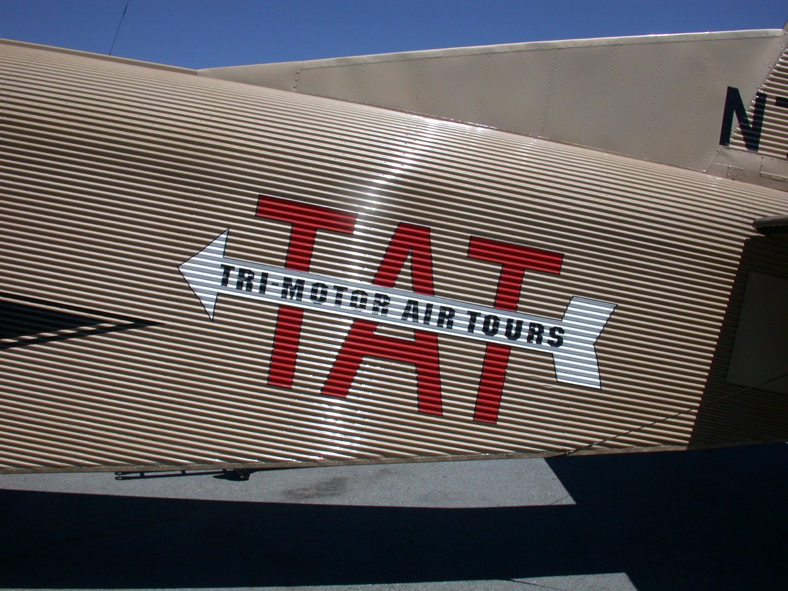 The latter-day livery identified N750RW as “Tri-Motor Air Tours,” not the historic “Transcontinental Air Transport.” Note the corrugated aluminum.