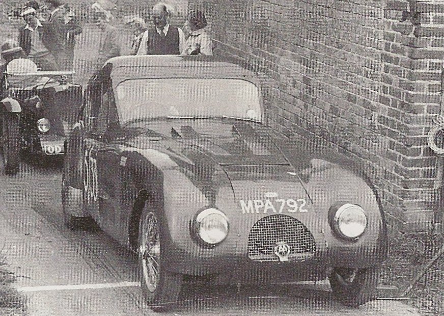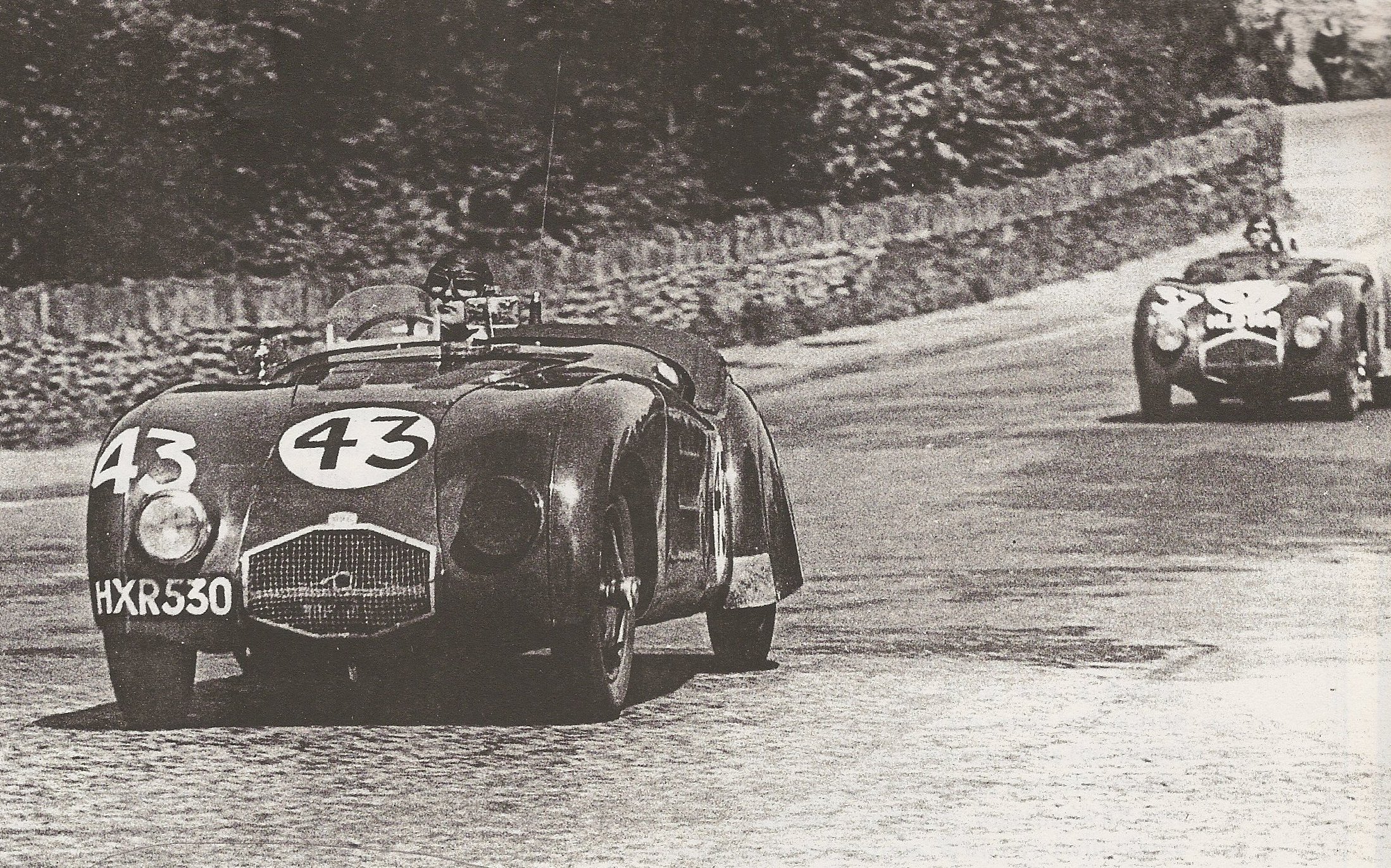A pair of HRGs at the 1948 Manx Cup, May 25, 1948. The radio antenna of #43 can be seen on its rear deck. Image by Guy Griffiths, from Specialist British Sports/Racing Cars of the Fifties & Sixties, by Anthony Pritchard, Osprey, 1986.