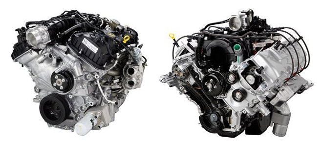 Engine choices for the 2013 basic rear-drive F-150 are the 3.5-liter EcoBoost V-6 at left or the 6.2-liter normally aspirated V-8 at right.