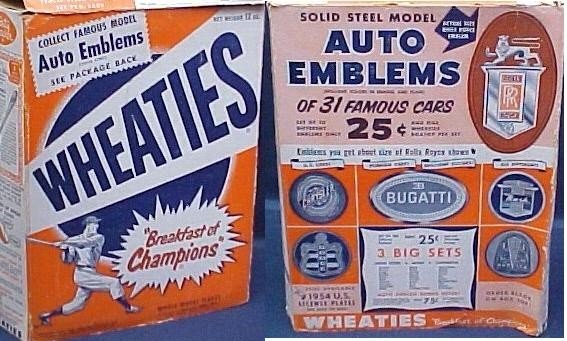 DURING THE 1950s, General Mills cereal brand Wheaties—even then “The Breakfast of Champions”—had a neat program of offering car emblems as premiums. Thirty-one of these embossed and painted tin badges were distributed in boxes of Wheaties cereal and also available in three sets, each set for 25¢ (“No stamps please”) and a Wheaties boxtop.