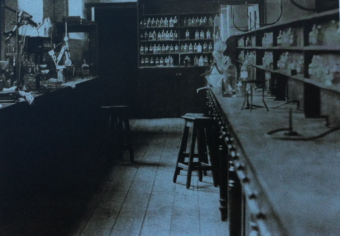 Above, St. Bartholomew’s Hospital (“Barts”), c. 1900. Watson’s “narrow lane” separates the two buildings. Below, a Barts chemical lab, 1906. Images from Sherlock Holmes in London.