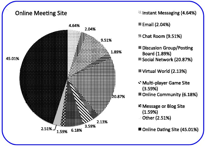The online data show how out-of-date I am, in that I was surprised by the multiplicity of these online meeting venues. Online dating sites were represented by 45 percent of the respondents. Social networks accounted for another 21 percent. Multiplayer game sites/virtual worlds attracted around 6 percent (do you suppose these are the e-bars/e-clubs?).