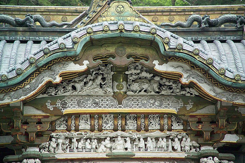 Above, Nikko Tōshō-gū Yomeimon; the shrine founded in 1617. Below, Nikko Karamon carving. The craftsmanship is evident; the aesthetics may be a bit much for western taste.